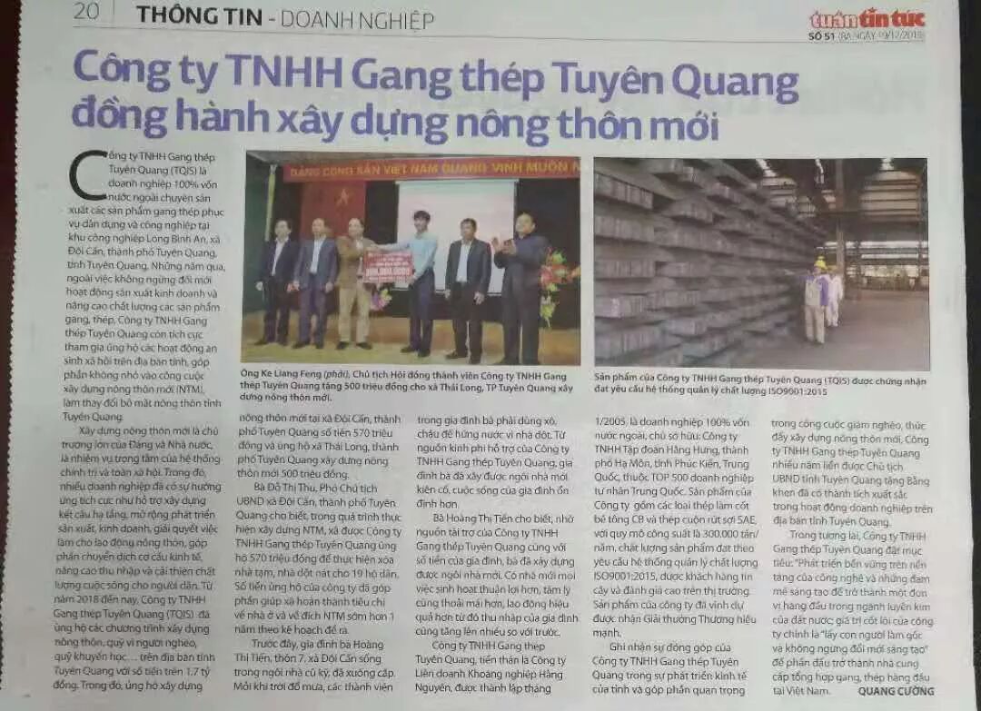 宣光鋼鐵有限責(zé)任公司(TQIS)主要以生產(chǎn)服務(wù)于民用、工業(yè)鋼鐵產(chǎn)品為主,公司廠區(qū)位于宣光省宣光市龍平安工業(yè)區(qū)。近幾年來(lái),公司除了不斷改善生產(chǎn)經(jīng)營(yíng)和提高鋼鐵產(chǎn)品質(zhì)量外,還積極參與本省社會(huì)民生公益、捐資等對(duì)社會(huì)有益的活動(dòng),通過(guò)活動(dòng)改變了本省農(nóng)村面貌,為本省新農(nóng)村建設(shè)事業(yè)做出了不小的貢獻(xiàn)。